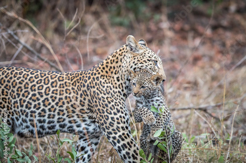 © simoneemanphoto, Obraz premium Leopard carrying a cub.
