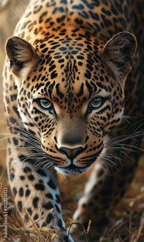 Obraz premium Leopard close-up, intense gaze, spotted fur.