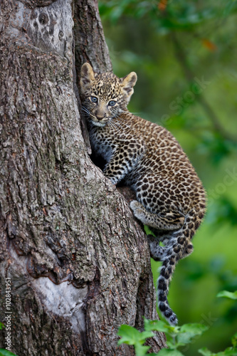 © maggymeyer, Obraz premium Leopard cub sitting on his tree hole in Masai Mara, Kenya