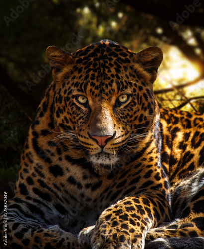 Obraz premium Leopard eye contact in dark forest