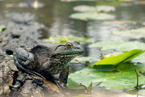 © Irina K., Naklejka premium Leopard frog (Rana pipiens) on a log in a pond and lily pads
