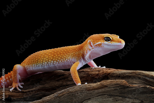 Naklejka premium Leopard gecko lizard crawling on wood, lizard isolated on black, eublepharis macularius