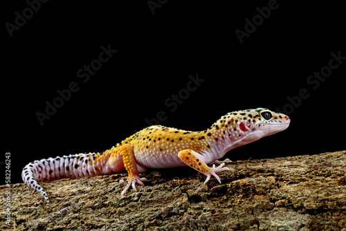 © Agus Gatam, Naklejka premium Leopard gecko lizard on branch with black background, eublepharis macularius, animal closeup