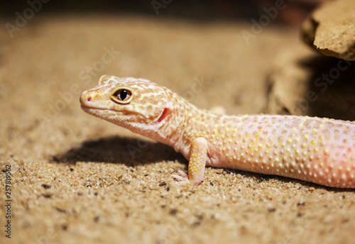 © galina_savina, Naklejka premium Leopard Gecko. On the top of the head, on the lips, back and tail are scattered small dark spots of irregular shape. Thanks to tenacious paws easily moves and conducts more vertical, than a land way o
