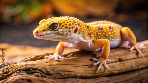 © anulak, Fototapeta premium Leopard gecko on wood posing on black background