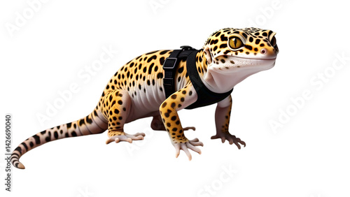 © Illustra, Obraz premium Leopard Gecko Standing on Rock – Curled Tail and Textured Skin Isolated on White Background