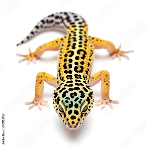 Obraz premium Leopard gecko with yellow black spots and patterned tail on white background...