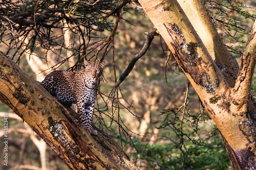 Fototapeta premium Leopard hiding on the tree. Nakuru, Kenya