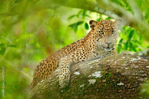 Obraz premium Leopard in green vegetation. Hidden Sri Lankan leopard, Panthera pardus kotiya, Big spotted wild cat lying on the tree in the nature habitat, Yala national park, Sri Lanka. Widlife scene from nature.