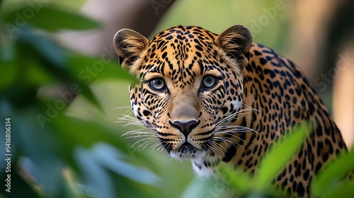 © puji, Obraz premium Leopard in Jungle with Intense Gaze.