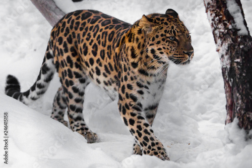© Mikhail Semenov, Fototapeta premium Leopard is coming, he is unhappy. Red-headed Far Eastern leopard is a powerful predatory beast against the white snow.