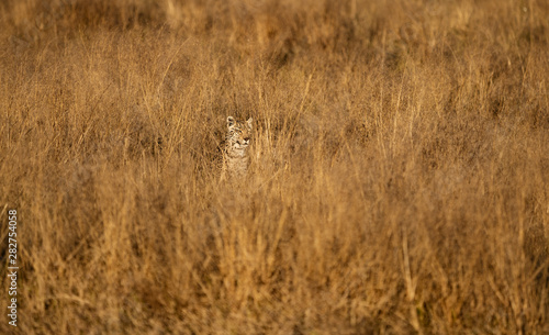 Obraz premium Leopard is nearly invisible in the short dry grass, as he stalks his prey in...