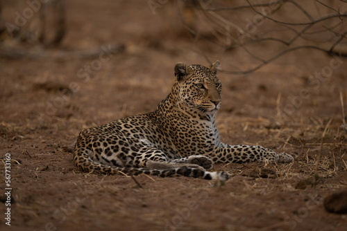 © Nick Dale, Obraz premium Leopard lies turning head beside branches
