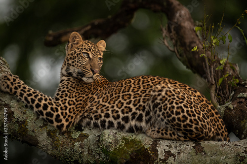© Nick Dale, Obraz premium Leopard lying on lichen-covered branch looks back