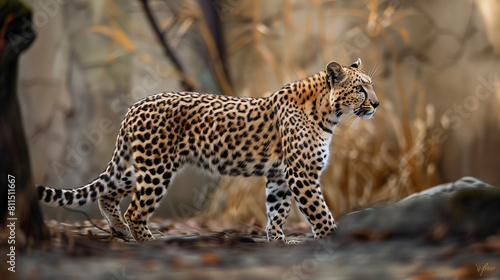 © Rao, Obraz premium leopard on the rock in tree yellow black dot health