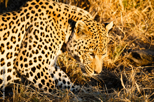 © mophoto, Fototapeta premium Leopard (Panthera pardus), liegt im hohen Gras