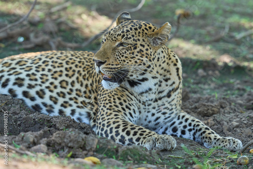Naklejka premium Leopard (Panthera pardus) resting on the ground in South Luangwa National...