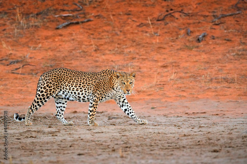 Obraz premium Leopard, Panthera pardus, walking in the red orange sand. Africa leopard in Kgalagadi desert in Botswana. Art wildlife nature, cat in wilderness. Wild spotted cat in the wild.