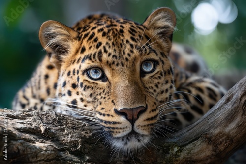 © YouraPechkin, Fototapeta premium Leopard resting on a tree branch in a lush jungle setting during the day