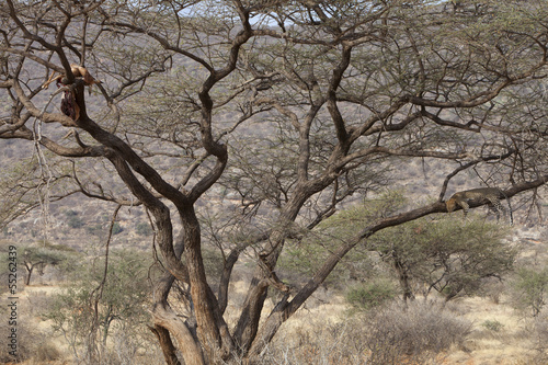 © Pedro Bigeriego, Fototapeta premium Leopard resting on a tree with prey hanging from a branch