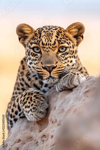 © Lubos Chlubny, Obraz premium Leopard Resting on Rock in Warm Light