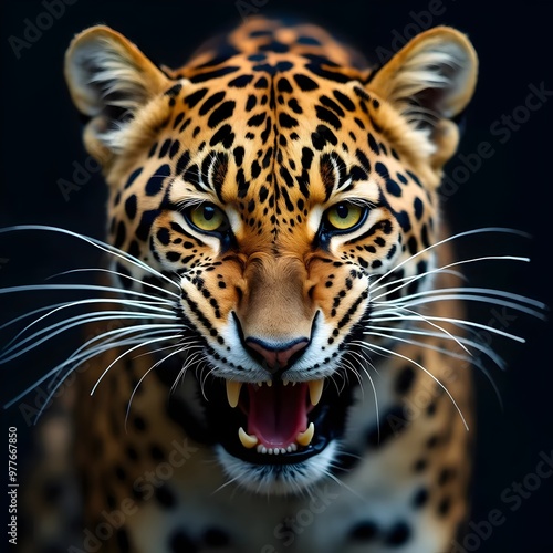 Obraz premium Leopard roaring headshot with sharp fangs and intense gaze
