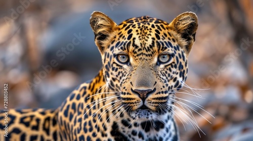 © Landscape Planet, Obraz premium Leopard's Watchful Eyes: A Detailed Portrait of an Indian Leopard, Whiskers and Spots Against Its Natural Rocky Habitat.