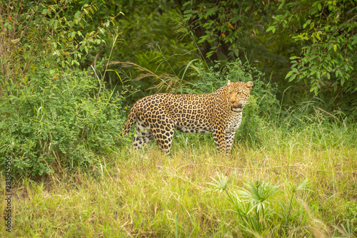 © Nick Dale, Obraz premium Leopard stands looking round with bushes behind
