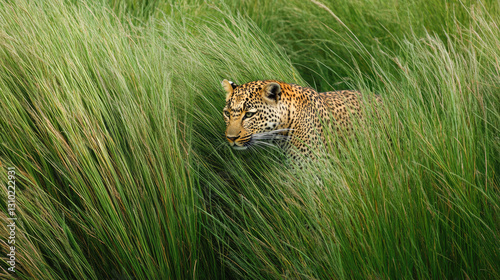 Fototapeta premium Leopard stealthily moving through tall grass in natural habitat