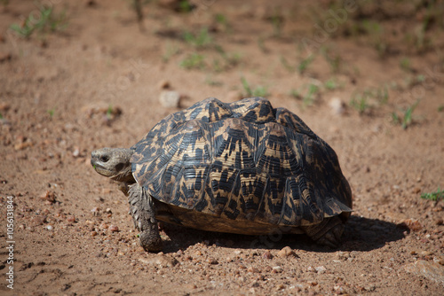 © DaiMar, Obraz premium Leopard tortoise crossing the road in Africa