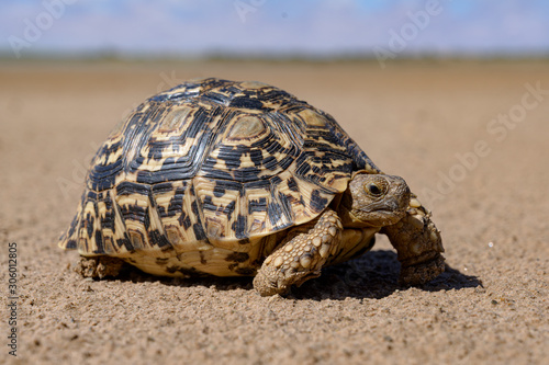 Fototapeta premium Leopard tortoise in a desert walking