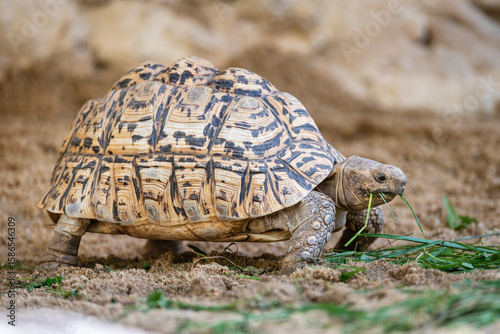 Fototapeta premium Leopard tortoise (Stigmochelys pardalis) in sand, Czech Republic, Europe