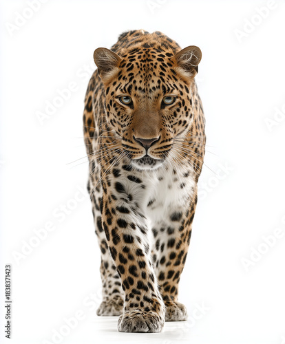 © amavcoffee, Obraz premium Leopard walking confidently isolated on white background.