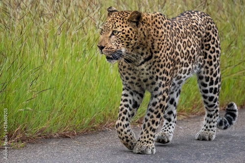 © robbyh, Obraz premium Leopard walking down the road while marking his territory