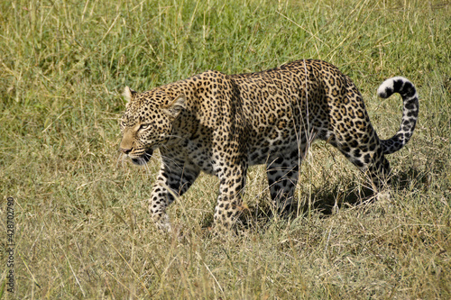 Obraz premium Leopard walking in long grass at midday, Masai Mara Game Reserve, Kenya