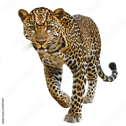 © Thanthara, Fototapeta premium Leopard walking on white background, showcasing its spotted fur