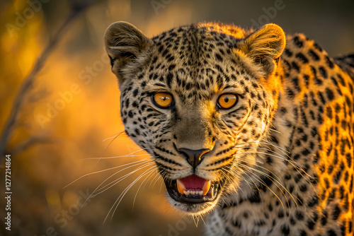 © PulseImages, Fototapeta premium Leopard Warrior Intense Stare in Fiery Sunset Glow