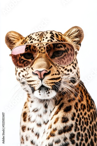 Fototapeta premium Leopard wearing stylish sunglasses looking cool and confident on white...