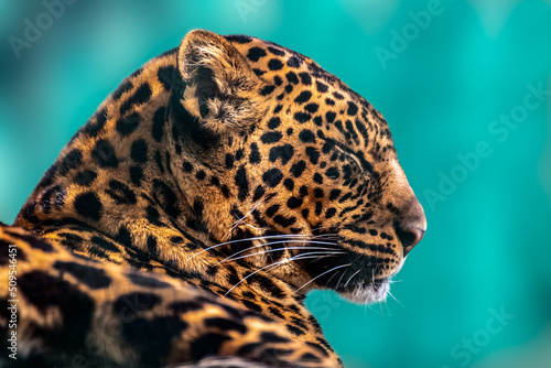 Fototapeta premium Leopard with nice fur peaceful portrait close-up view. Extant species in the...