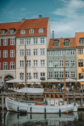 © Alexandre, Naklejka premium Les maisons colorées sur les rives du canal Nyhavn, au cœur de la ville de Copenhague au Danemark, avec des bateaux