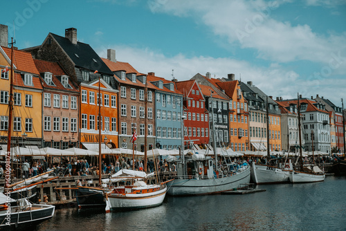Naklejka premium Les maisons colorées sur les rives du canal Nyhavn, au cœur de la ville de Copenhague au Danemark, avec des bateaux