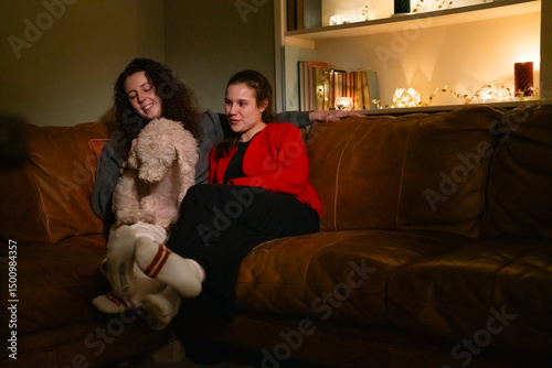© Christina, Obraz premium Lesbian couple sitting on sofa with dog at home on Valentines day