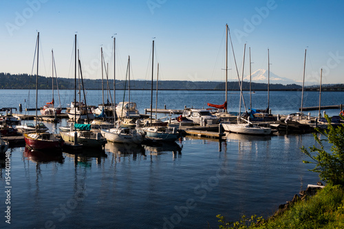 Fototapeta premium Leschi Marina and view of Mount Rainier, Seattle, Washington State, USA.