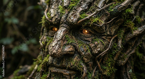 © Andrey, Obraz premium Leshy forest spirit face made of bark and moss