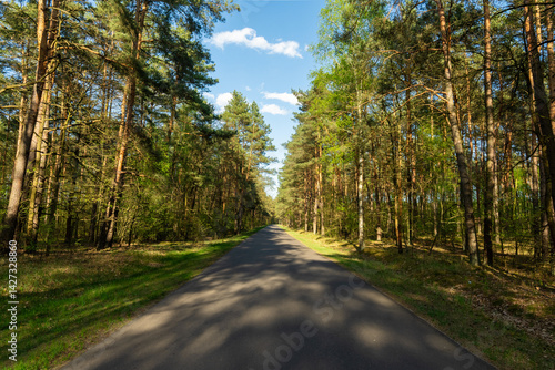 Naklejka premium Leśna droga asfaltowa – prosta trasa przez wiosenny las