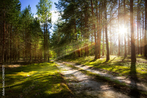 Fototapeta premium leśna droga na starym sosnowym lesie z promieniami wschodzącego słońca
