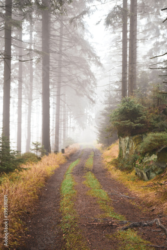 Fototapeta premium Leśna droga w jesiennej mgle