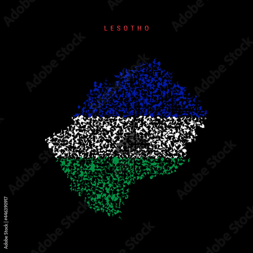 © Ivan Burchak, Obraz premium Lesotho flag map, chaotic particles pattern in the Kingdom of Lesotho flag colors. Vector illustration