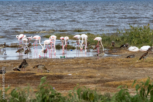 Fototapeta premium Lesser and Greater Flamingos with Egyptian Geese wading in the shallow waters of Lake Nakuru National Park Kenya
