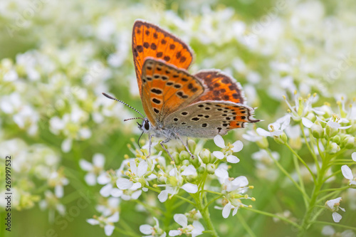 Obraz premium lesser fiery copper butterfly sitting on white flowers